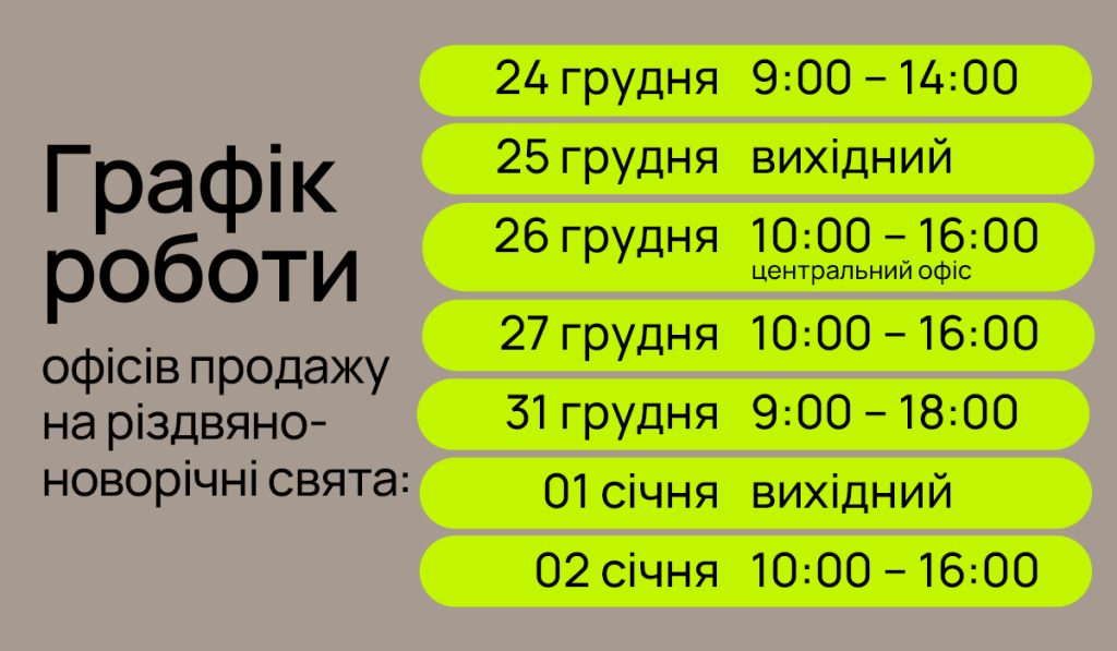 Наближається Різдво та новорічні свята. І щоб вам було зручно спланувати візит до нас, залишаємо інформацію про години роботи у ці дні.